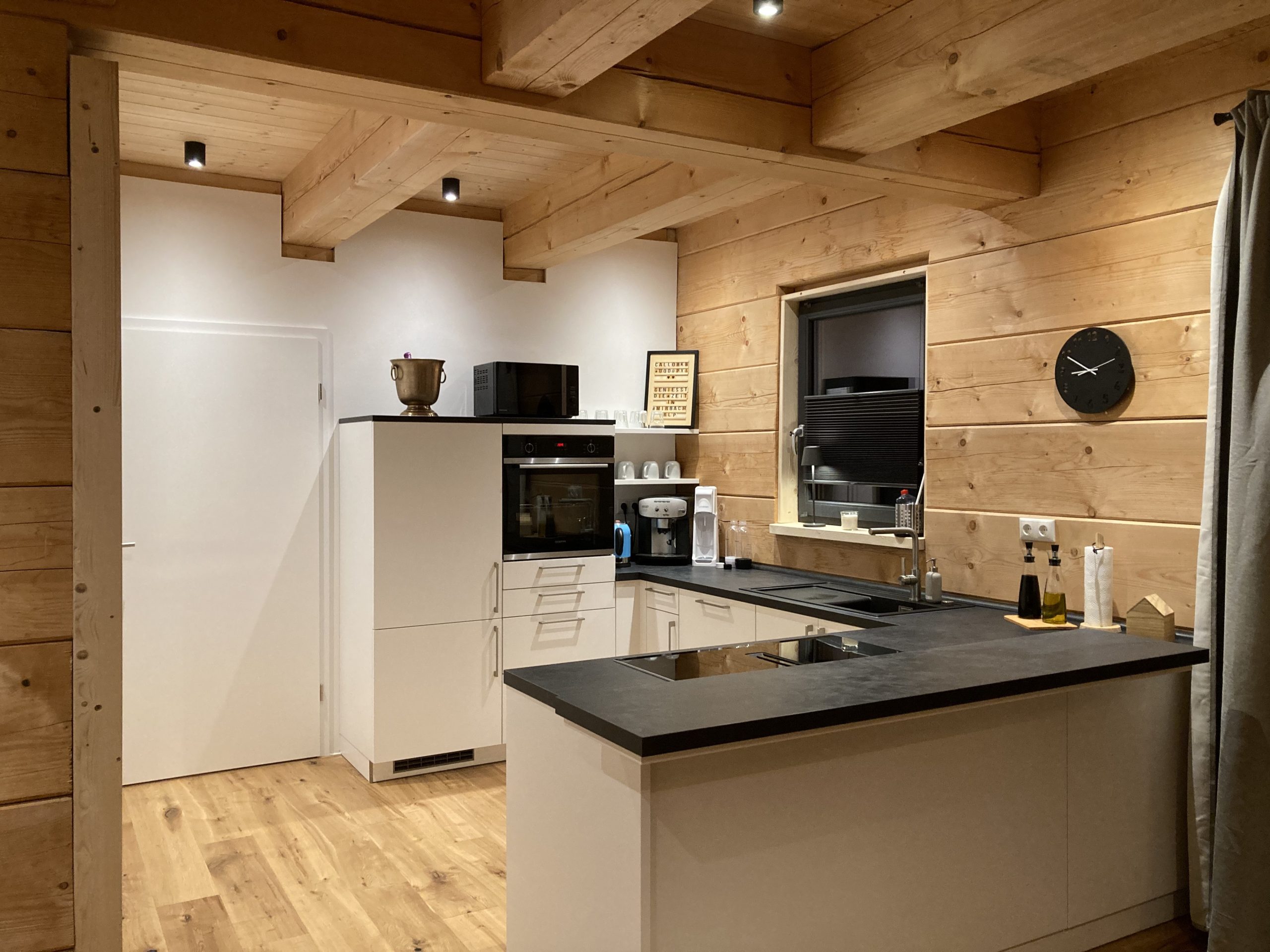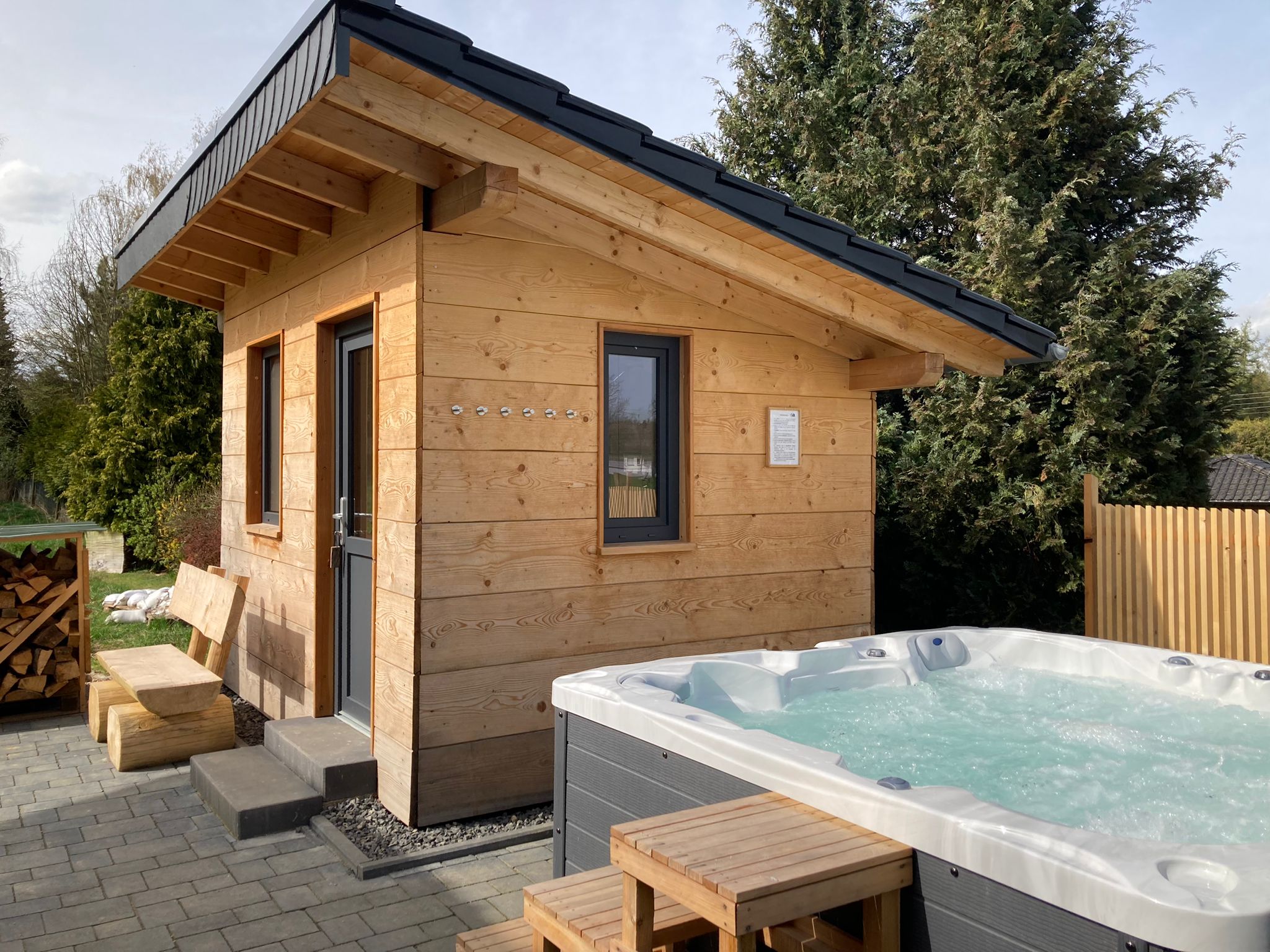 Im Außenbereich befindet sich ein privater Spa-Bereich mit Whirlpool und Blockhaussauna. Nach einem Tag in der Natur können Sie anschließend im Whirlpool oder bei einem Saunagang entspannen. Anschließend können Sie auf der Terrasse mit Blick in die Natur und einem guten Buch abschalten. Das Haus bietet acht Schlafplätze für Erwachsene. Auf Anfrage können bis zu zwei Reisebetten für Kinder bis zu zwei Jahren bereitgestellt werden.