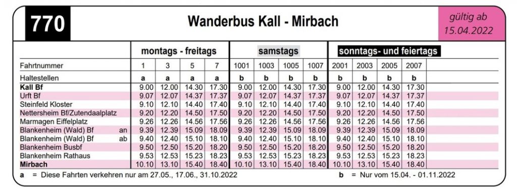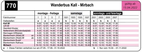 Das Ferienblockhaus-Eifel in Mirbach ist über den Wanderbus und den Bahnhof-Kall mit den öffentlichen Verkehrsmitteln zu erreichen. Kall erreichen Sie über Köln. Bitte informieren Sie sich über die genauen Fahrzeiten.